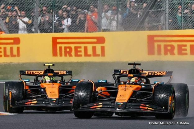 Piastri gets the better of Norris early in delayed wet-to-dry race as McLaren finish 1-2 again; Leclerc holds off Verstappen for P3